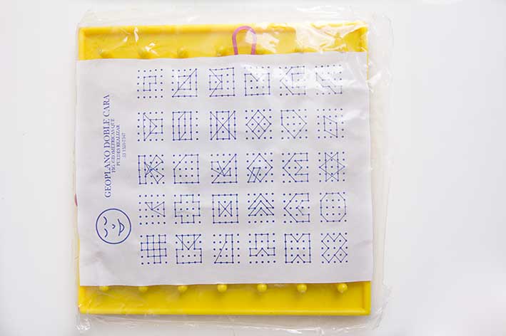 Es un cuadrito con pequeñas pijas por ambas caras, por un lado 25 y por el otro 30, que viene con 7 ligas de colores. Las ligas se utilizan para crear diseños al atorarlas en las pijas. Viene con un mapa con varios modelos para formar con las ligas, que van desde muy sencillos hasta complejos. Lo mejor es que una vez que se hallan armado éstos, su utilidad es infinita, pues se pueden crear cuantos diseños le vengan en mente.