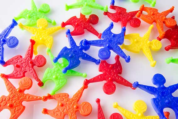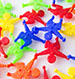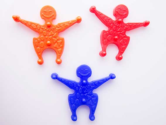 Divertidas figuritas de plástico con forma de payasitos. Tienen en sus manos y pies entradas tipo hembra-macho para embonar entre ellos y poder crear divertidas formas. Sus colores brillantes e infinidad de posibles formas los hacen un juguete muy divertido que desarrolla la imaginación de los niños.